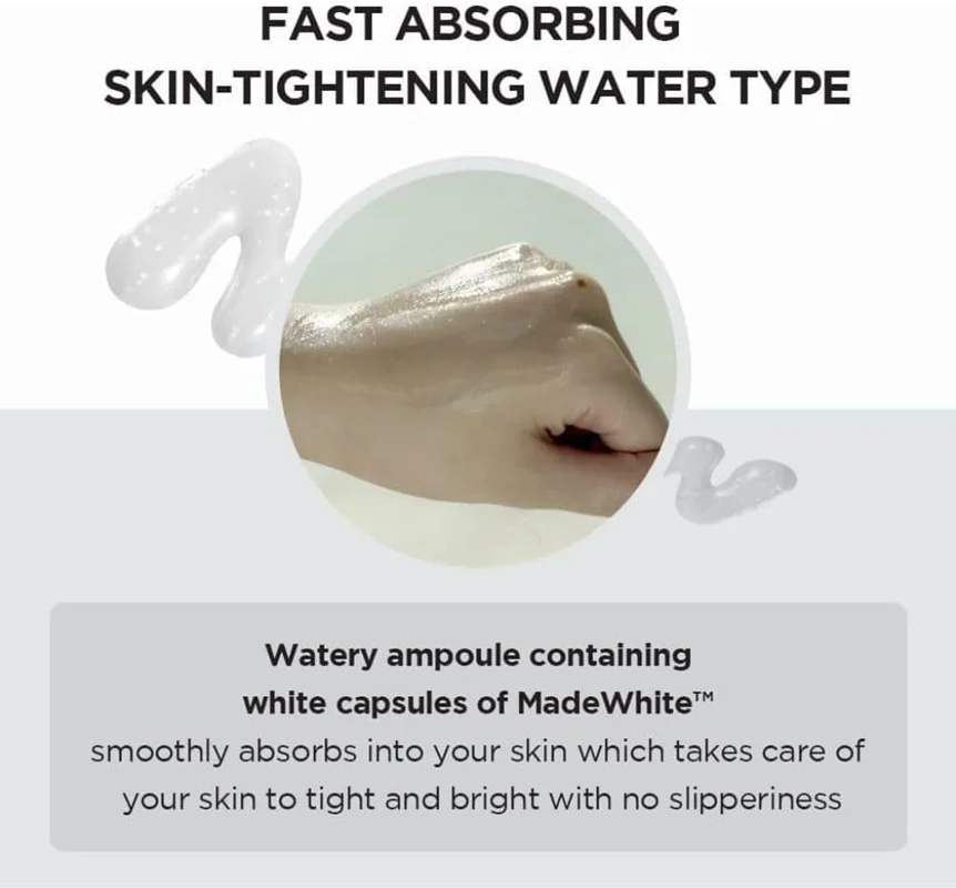 - بافت و جذب: این آمپول بافتی شبیه به اسنس (essence-like) دارد که با میکرو-بیادهای MadeWhite™ (یک ماده پتنتشده طبیعی) غنی شده. این مواد به سرعت جذب پوست میشوند و حس چسبندگی یا سنگینی ایجاد نمیکنند. نتیجه آن، پوستی نرم، براق و هیدراته بدون چربی اضافی است. فناوری Oil-in-Water Gel در آن استفاده شده که هیدراتاسیون عمیق و طولانیمدت فراهم میکند.