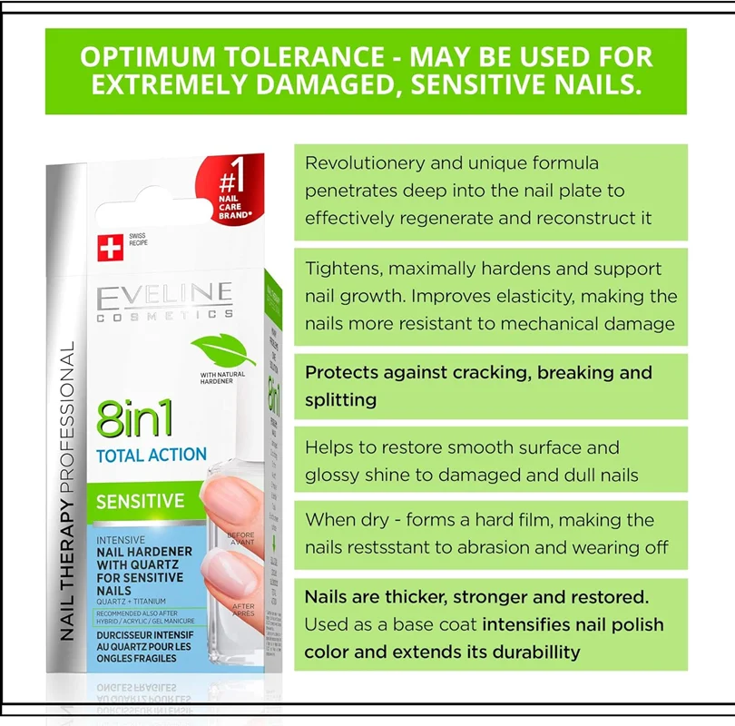 فرمول انقلابی با کمپلکس Strong Nail (شامل آلدئید طبیعی) و کوارتز برای نفوذ عمیق بدون آسیب به ساختار ناخن. مواد اصلی بر اساس لیست استاندارد محصولات Eveline: