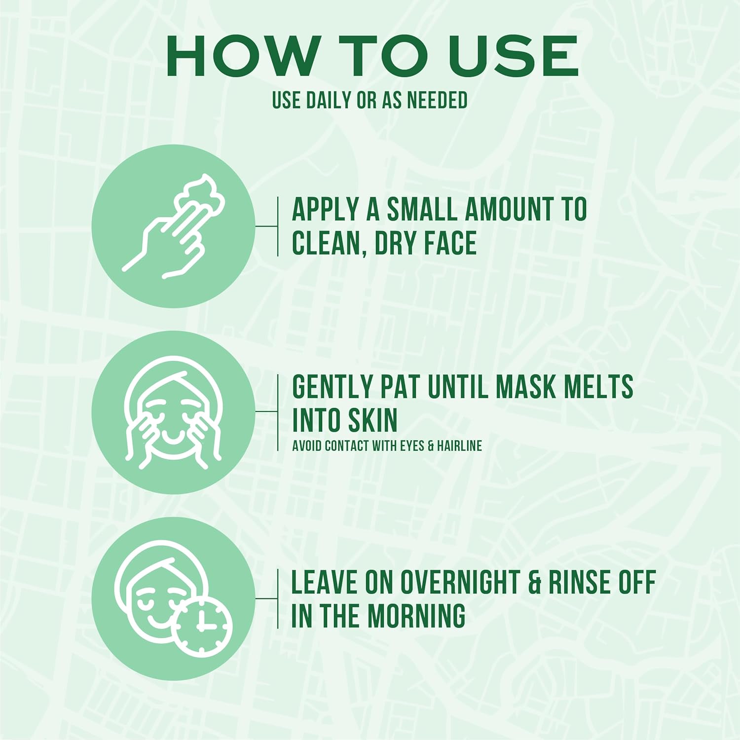 - این محصول بهگونهای طراحی شده که میتوان آن را بهعنوان ماسک شبانه استفاده کرد. کافی است مقدار کمی از ژل را روی پوست تمیز و خشک بمالید، بهآرامی ماساژ دهید تا جذب پوست شود، سپس بگذارید در طول شب روی پوست بماند و صبح آن را بشویید.