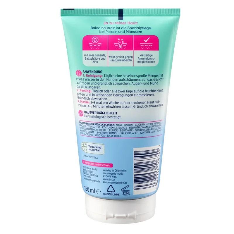 پاک کننده، لایه بردار و ماسک ضدجوش باله آ یک محصول چندکاره مراقبت از پوست است که سه عملکرد اصلی را در یک محصول ارائه میدهد: پاککننده، لایهبردار و ماسک صورت. این محصول بهطور خاص برای پوستهای دارای جوش و مستعد جوش طراحی شده و با ترکیبات فعالی مانند خاک رس صورتی (rosa Tonerde)، اسید سالیسیلیک و زینک به بهبود وضعیت پوست کمک میکند. در ادامه توضیحات دقیقتری در مورد ویژگیها و کاربردهای این محصول به فارسی ارائه میشود: