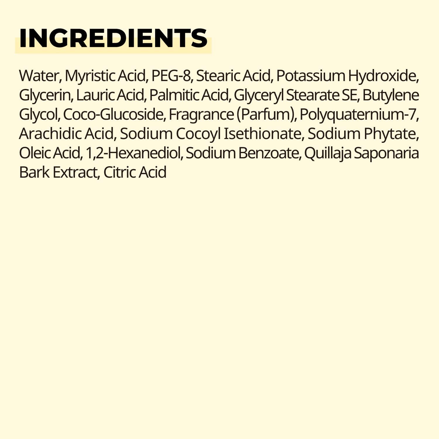 - مواد دیگر: Quillaja Saponaria Bark Extract (عصاره پوست درخت صابون برای فومسازی طبیعی)، Coco-Glucoside (سورفکتانت ملایم)، و اسیدهای چرب مانند Myristic Acid و Stearic Acid برای بافت کرمی.