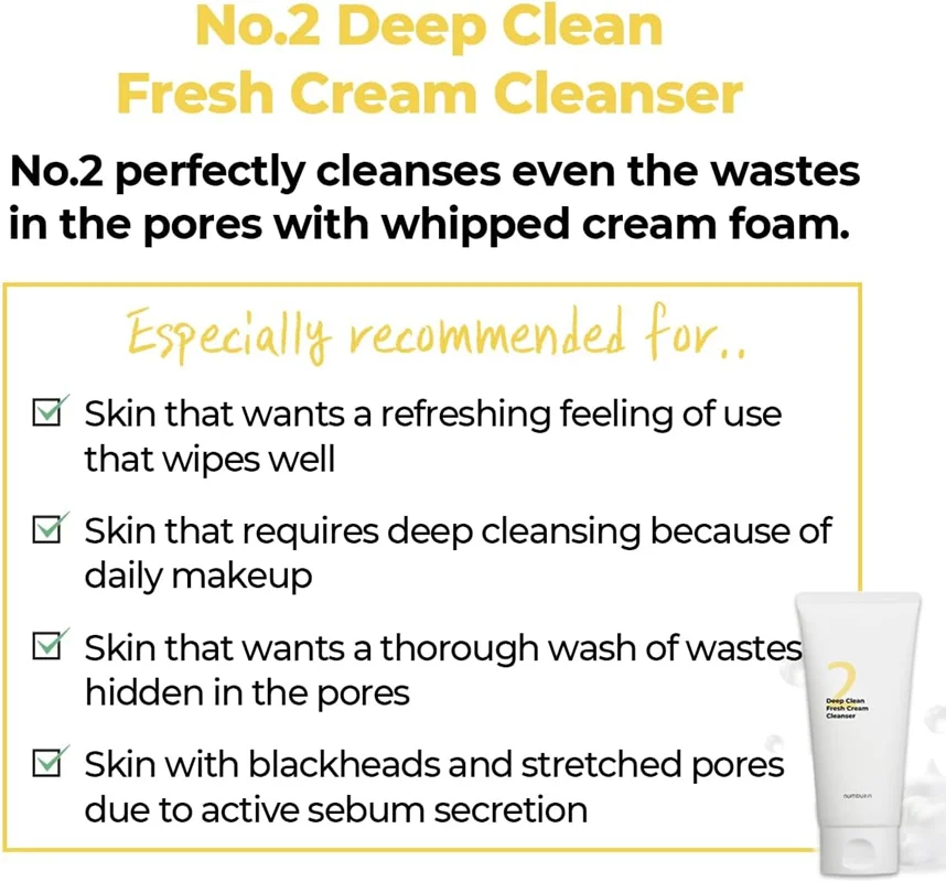 کرم پاک کننده عمقی پوست شماره 2 نامبوزین یک شوینده صورت کرهای از برند محبوب Numbuzin است که به عنوان یک فوم کرمی تمیزکننده عمقی شناخته میشود. این محصول با فرمولاسیون غلیظ و بافتی شبیه به خامه زدهشده (whipped cream)، برای پاکسازی عمیق منافذ پوست، حذف آرایش، چربی اضافی و آلودگیها طراحی شده است، بدون اینکه پوست را خشک یا تحریک کند. این شوینده بخشی از روتین دو مرحلهای پاکسازی (double cleansing) است و برای همه انواع پوست، از جمله پوست حساس، مناسب است. حجم آن ۱۲۰ میلیلیتر است و در کره جنوبی تولید میشود.